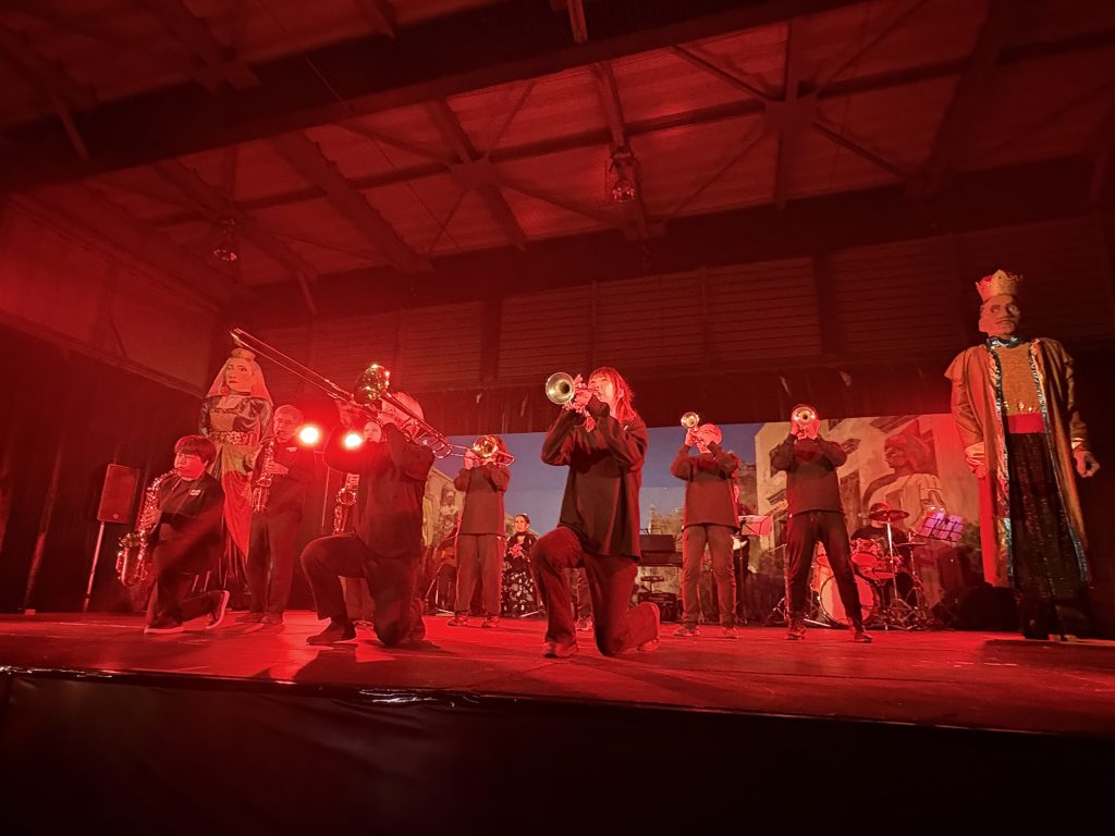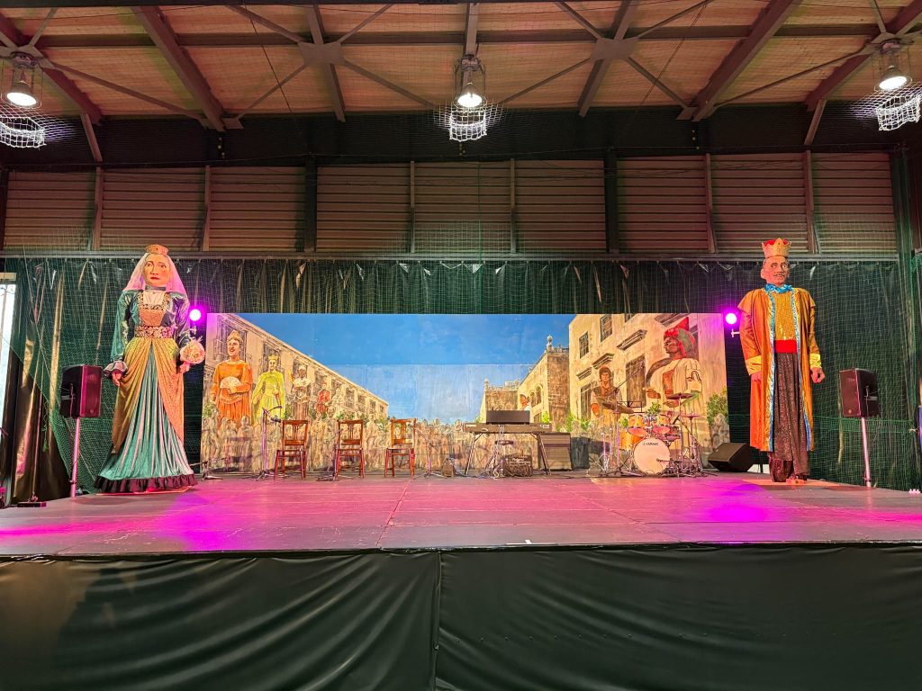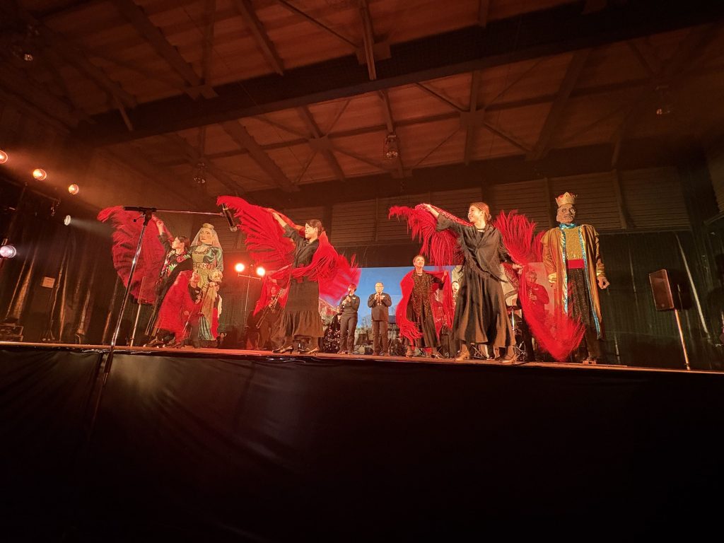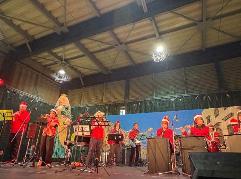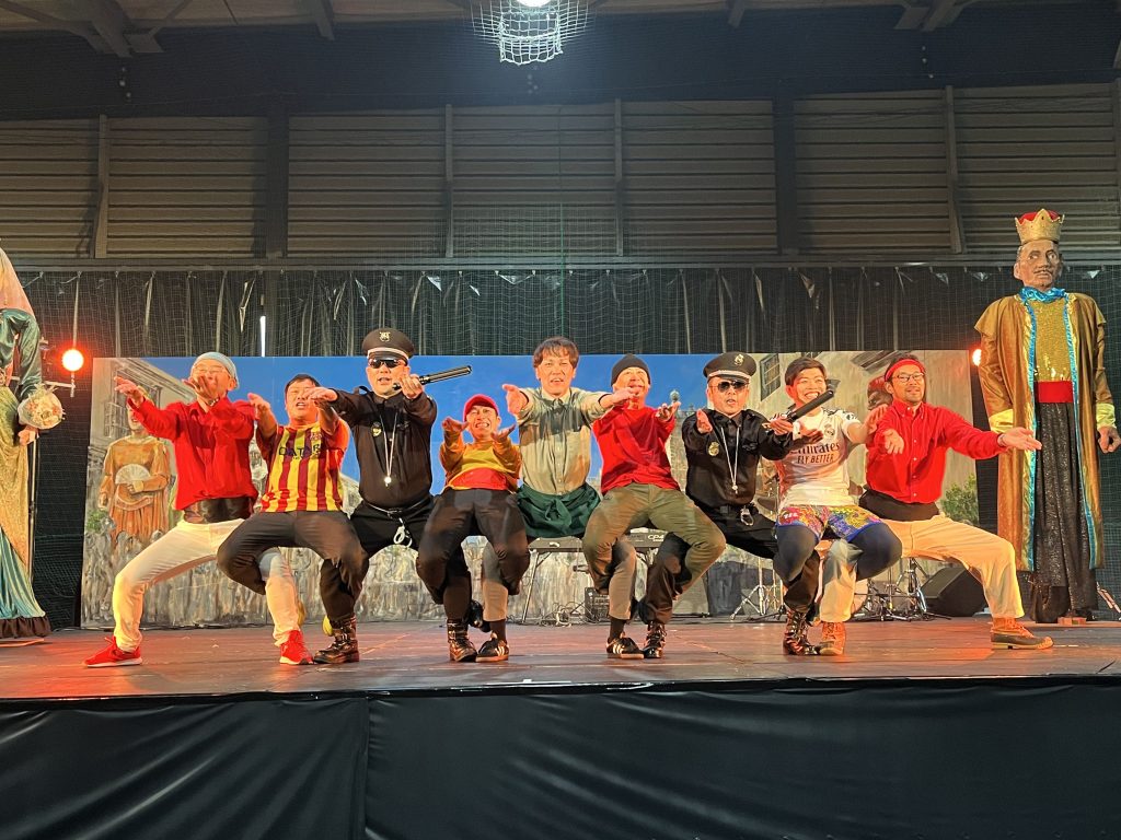 会場に設置された4つのヒガンテスは、バルセロナ最大の祭りであるメルセ祭で町中を踊りながらパレードする巨大人形です。舞台のバックに立てられた壁画のモチーフもメルセ祭り。これら素晴らしい舞台美術は佛子園のスタッフと利用者さん、地域住民の方々によって制作されました。表現することの大変さと楽しさが伝わってきます。