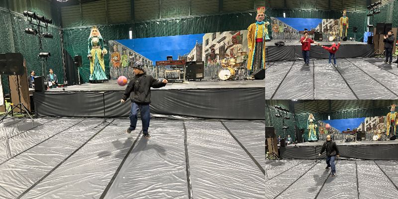 舞台奥中央に壁画。それを挟むようにして立つヒガンテス。すべて手づくりです。会場にも2体あります