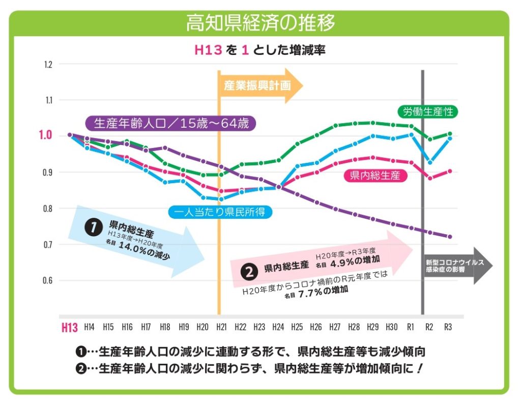 高知県の経済は平成13(2001)年から、生産年齢人口、労働生産性、県内総生産、一人当たりの県民所得が揃って低下していました。平成21(2009)年に産業振興計画が開始されたのを機に、各経済指標は上昇傾向に転じ、有効求人数も増えていきました。コロナ禍でいったん落ちたものの、その後、再び回復しています。